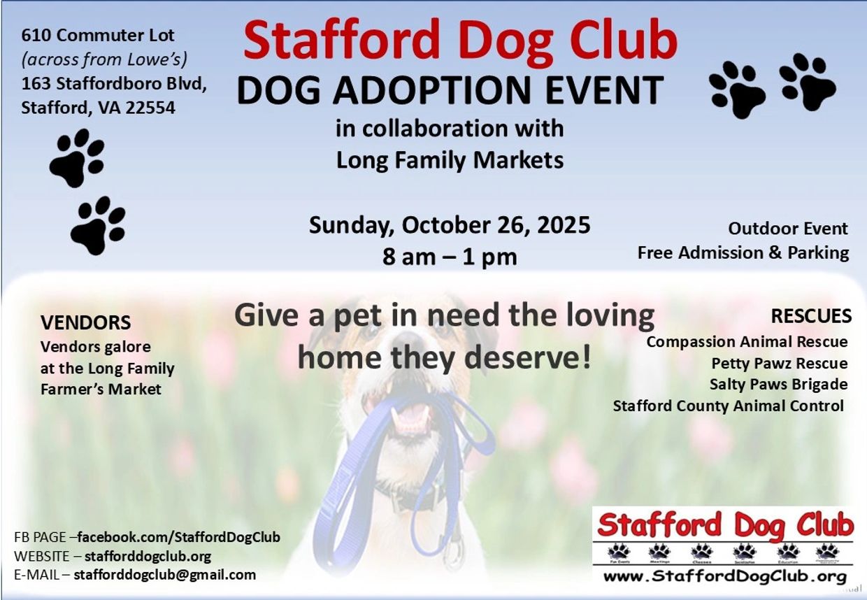 The Stafford Dog Club, invites you to a heartwarming 'Dog Adoption Event'! On Sunday, October 26th, from 8:00 AM to 1:00 PM, at the Long Family Farmer's Market, 163 Staffordboro Blvd. (in the commuter parking lot across from Lowe's) and help a furry friend find their forever home!